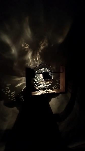 Requirements for the space: darkness, temperature, colouring (light / dark / specific colour / other) etc.: Darkness, at least moderate darkness. White or light-coloured wall or other surface behind the artwork as a "projection surface".