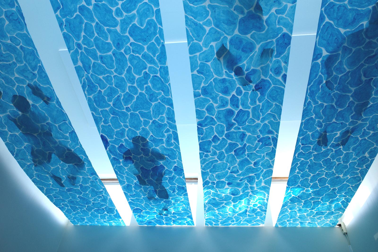 The artwork was created for an art exhibition held in a building scheduled for demolition, with the theme of health, inspired by the building’s history as a health center. I was given a small lobby space with four opposing windows, which led my thoughts to swimming lanes. I wanted to take advantage of the upper windows in the lobby to backlight paper. My goal was to explore the three-dimensional shadow qualities of paper—how a cut-out human figure would only partially appear through a painted paper swimming pool. I had long wanted to experiment with paper on a large scale, hoping to demonstrate its potential as a material for public art. In paper-based works, placing the piece out of reach is essential, which led me to install the artwork on the ceiling—or rather, just below it—high enough to prevent physical contact. This also gave the swimmers and swimming lanes an ethereal nuance. I was reminded of the old Roman saying: “Mens sana in corpore sano”.